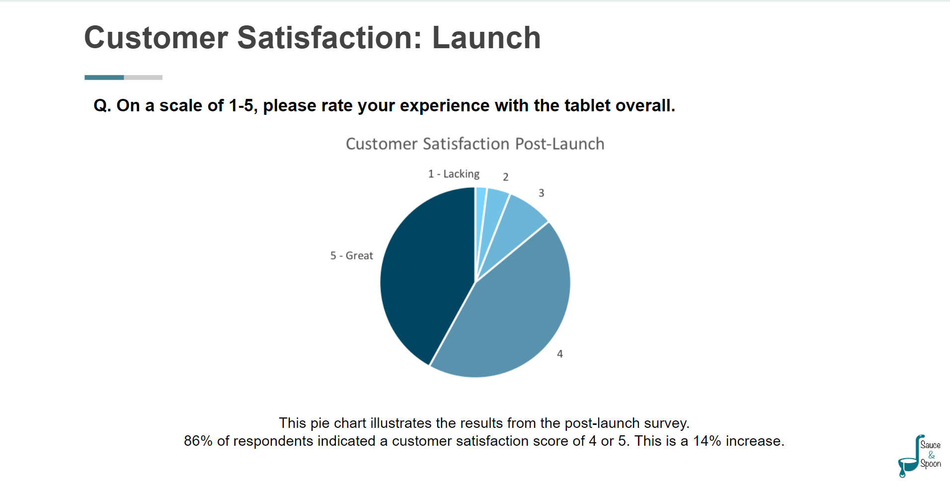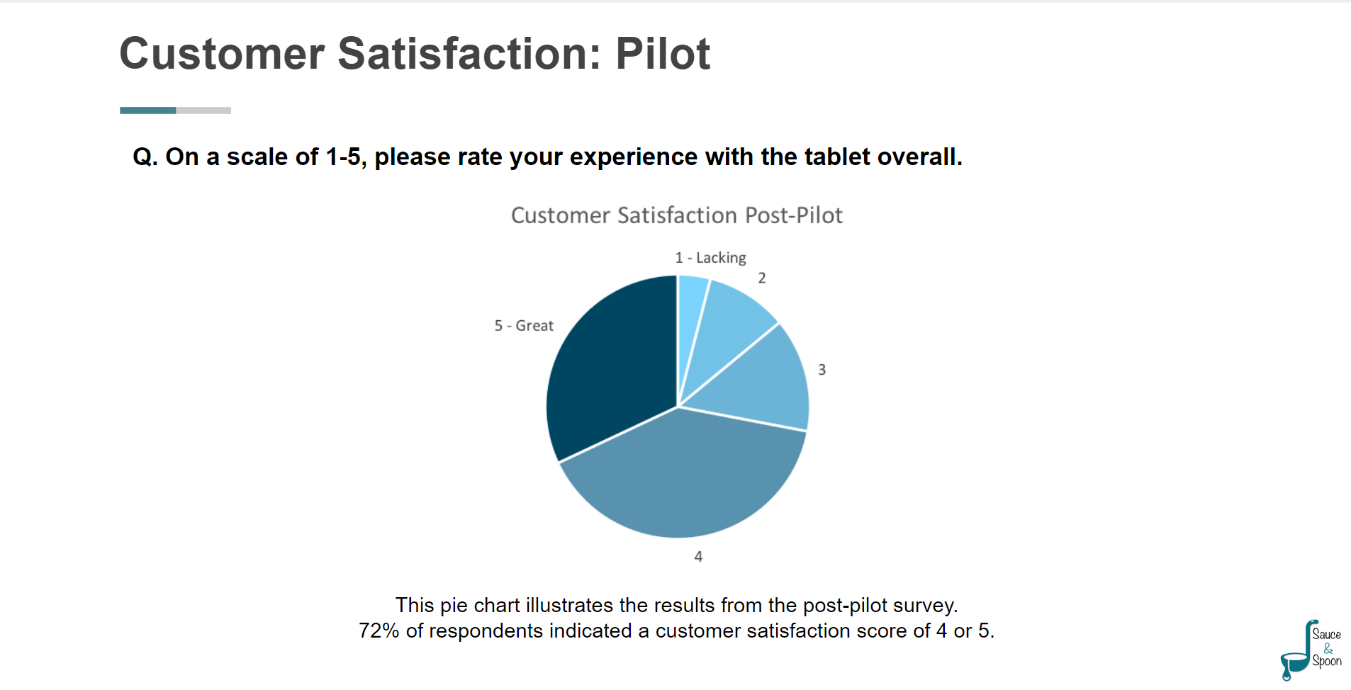 After successfully reaching the test launch milestone, gathering 50 customers to do a test run of the tablets, Sauce and Spoon had conducted a survey to get a better understanding of their dining experience. Allowing the restaurant to ensure the project had met its quality standards while also identifying any issues or concerns that came up during the test launch.