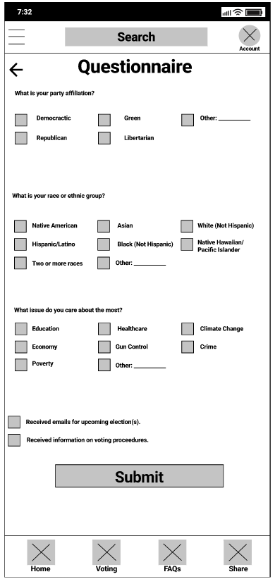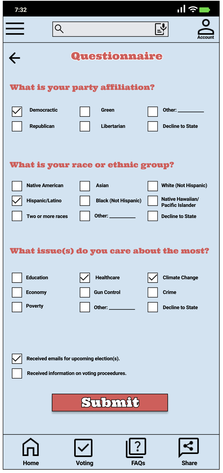 The overall navigation within the app was well-received, including the Register to Vote feature. As a whole, participants expressed feeling comfortable when navigating with the home screen to access the registration feature. Contrary to that, the Questionnaire screen seemed to be the least liked by participants as they wondered if they could either skip it or had the option to decline to state an answer.
