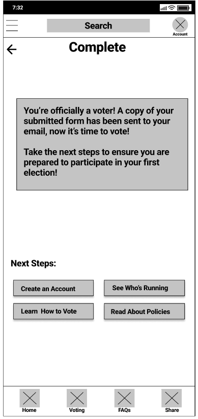 After submitting the questionnaire users are finally directed to the Complete screen indicating that their registration has been completed and they can official vote. This screen informs users that a PDF copy of their registration form has been sent to the email provided along with provided links to other features within the app such as creating an account, learning how to vote or reading about policies allowing users to access additional resources within the app.