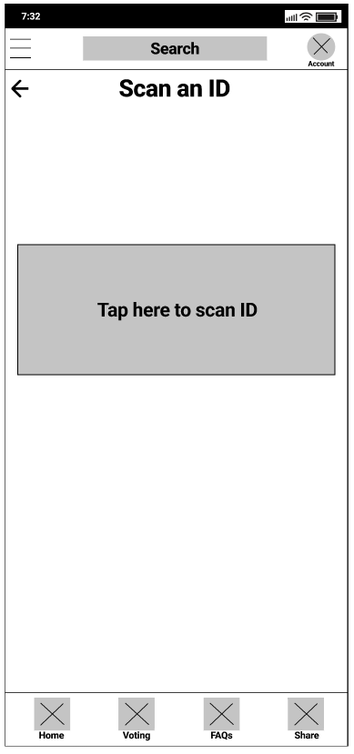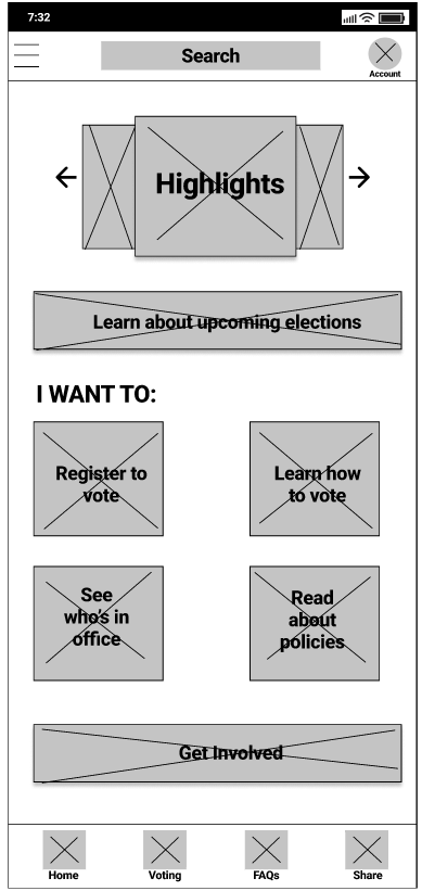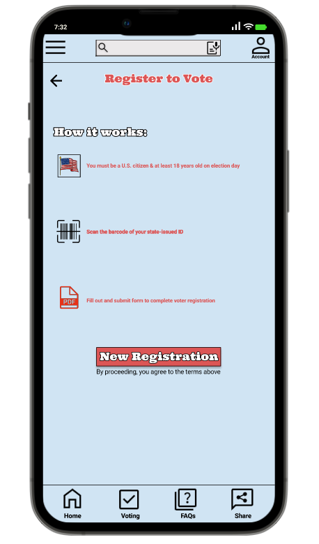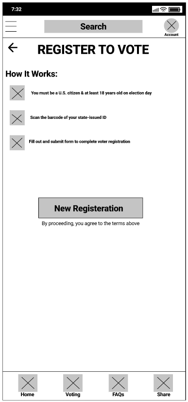 Initially, I wanted to design the app to follow a sequence of events best suited for its users. When first opening the app, naturally users would land on the home screen where they are presented with the various resources they are looking for in regards to voting and politics. However, with the main focus of this app being the ability to register to vote, I knew I wanted the flow for the prototype to include the process of them being able to register to vote.