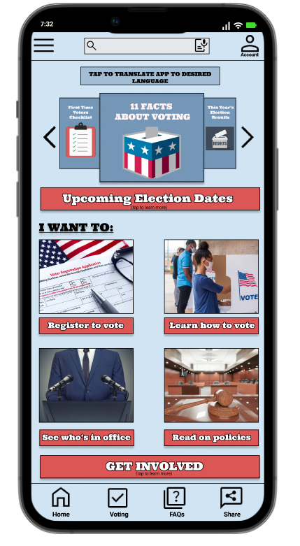 This proposed mobile application was made to allow first time voters to access information and resources regarding voting in the United States, in attempt to increase voter turner out rates through out the country.