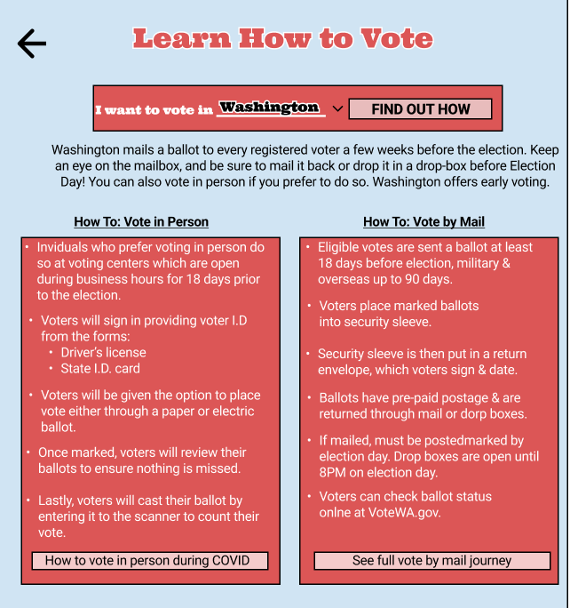 I learned that even though my main focus was ensuring first-time voters had access to registering to vote, by diligently going through each step of the design process and aligning with specific user needs, helped me come up with additional voter resources for users that were both useful and easy to comprehend for both who are new to voting as well as first-generation immigrants wanting to get involved with U.S. politics.