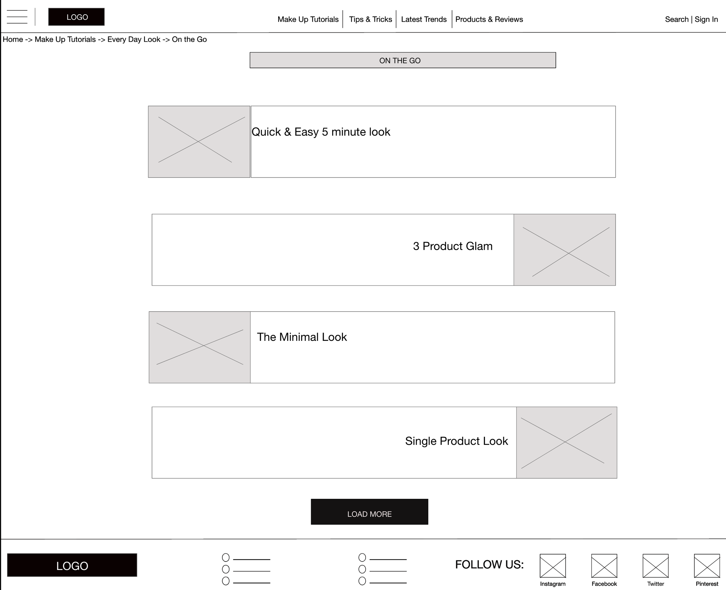Being the main focus of the website, this screen, and its corresponding screens are the ones I spent the majority of my time wireframing. Taking some inspiration from similar websites, I decided to keep this portion of the website as simple and straightforward as possible. Tutorials are split into four main categories - each having its own sub-page, which from there users can distinguish the types of looks they’re looking for that fall within each category. Ranging anywhere from simple looks to intricate trends, users can find almost all types of tutorials throughout the website.