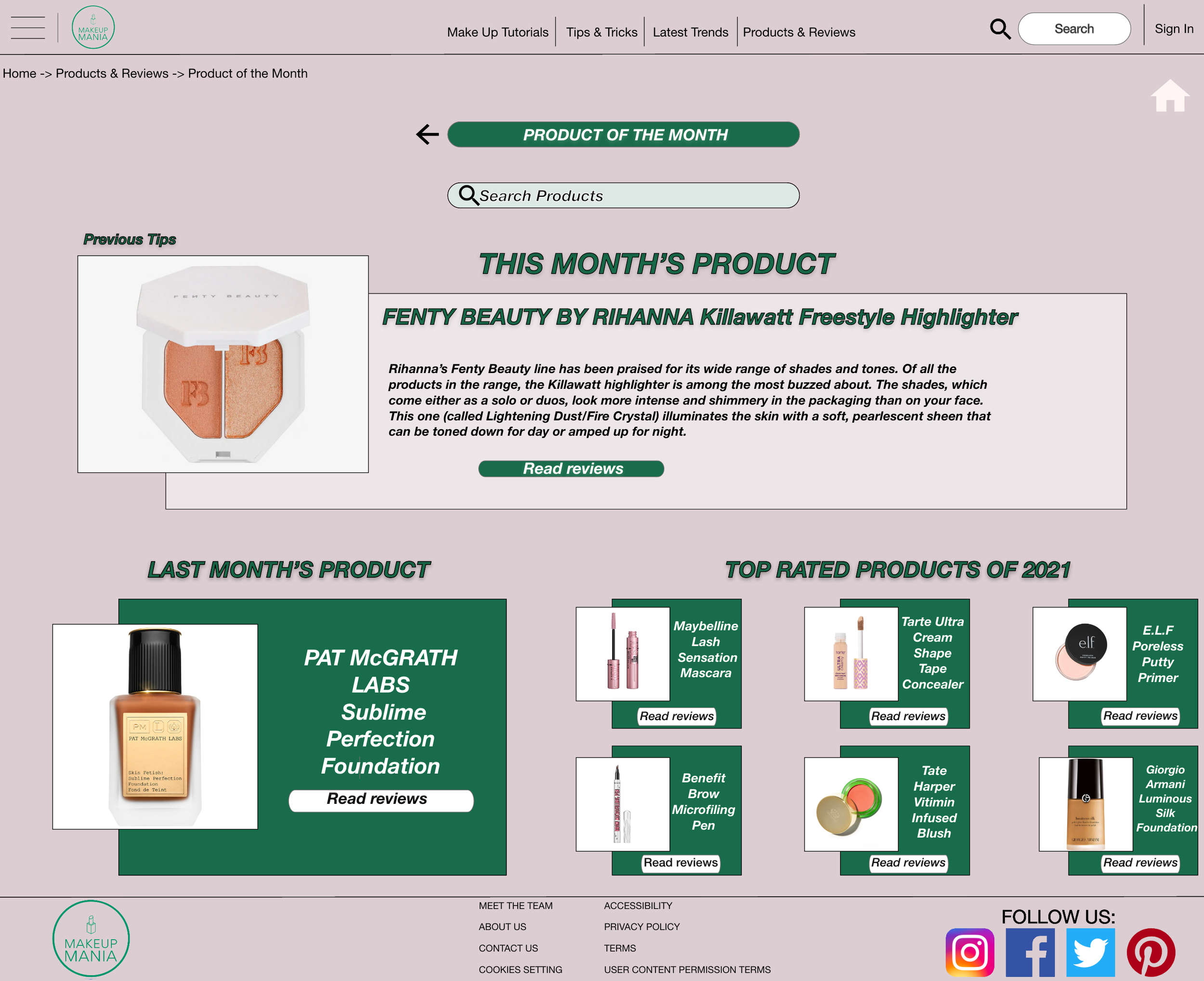 Wanting the opportunity to come up with my own branding rather than borrowing existing concepts, I decided to create a fictional company called Makeup Mania, Inc. to be the client for this website. Makeup Mania, Inc. is an American media and technology that is the parent to media property Makeup Mania - a monthly subscription for all things makeup. Similar to most beauty websites, it also offer product reviews, latest trends, tips and tricks, and celebrity looks.
