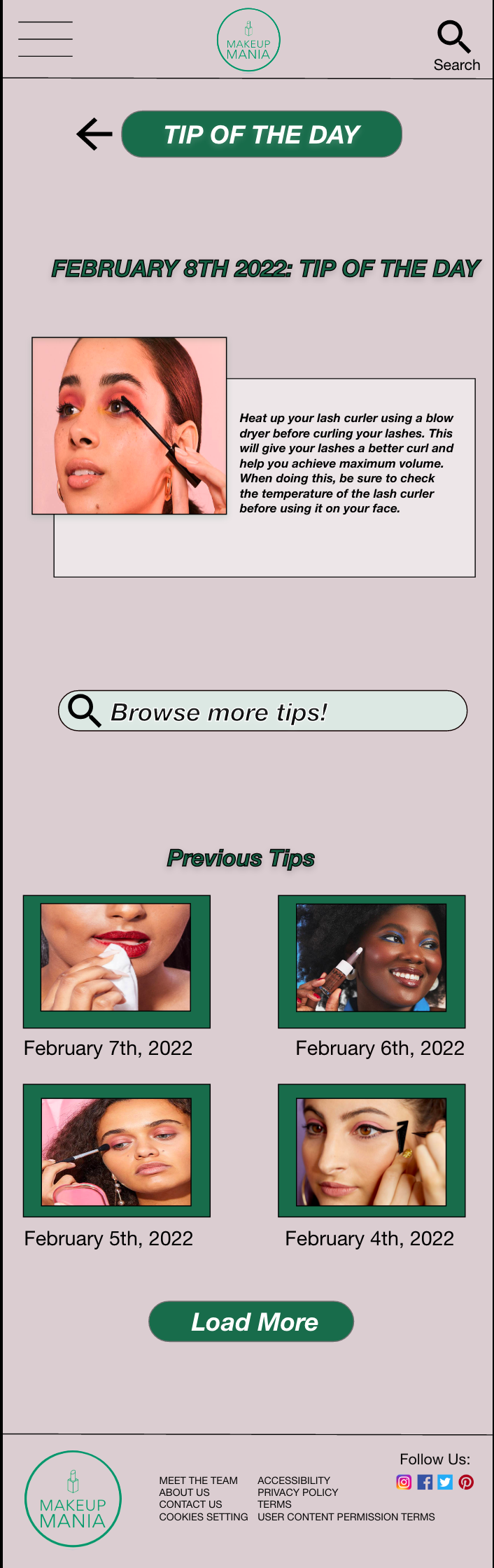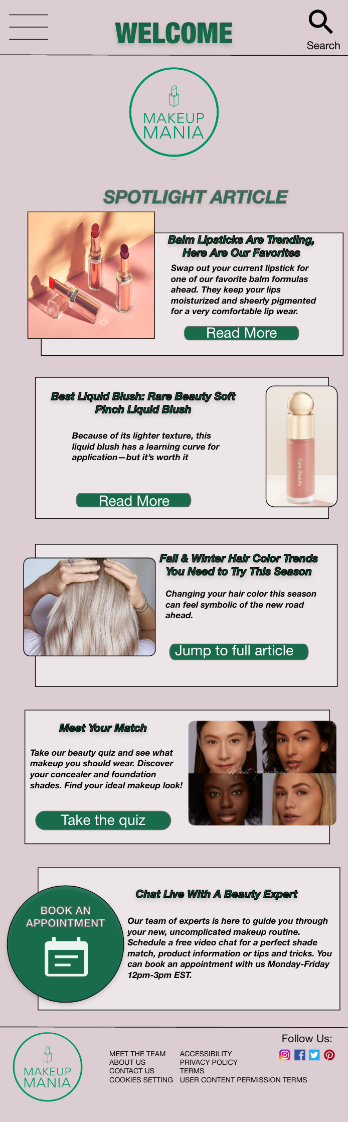 In regards to the color scheme, I decided to stick with Makeup Mania, Inc.’s company’s theme, a dusty pink with green accents, keeping both the website and the company consistent and uniform to each other.