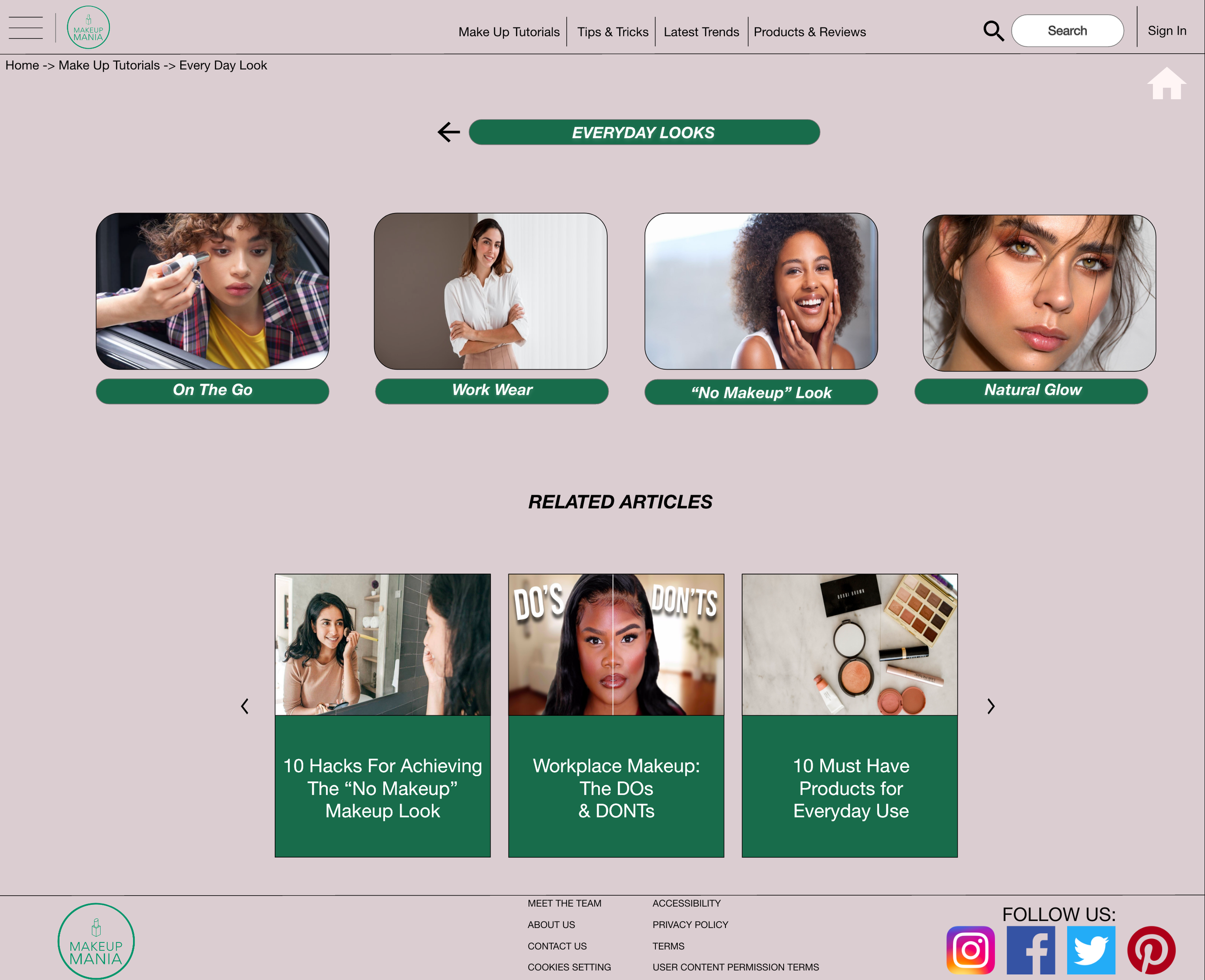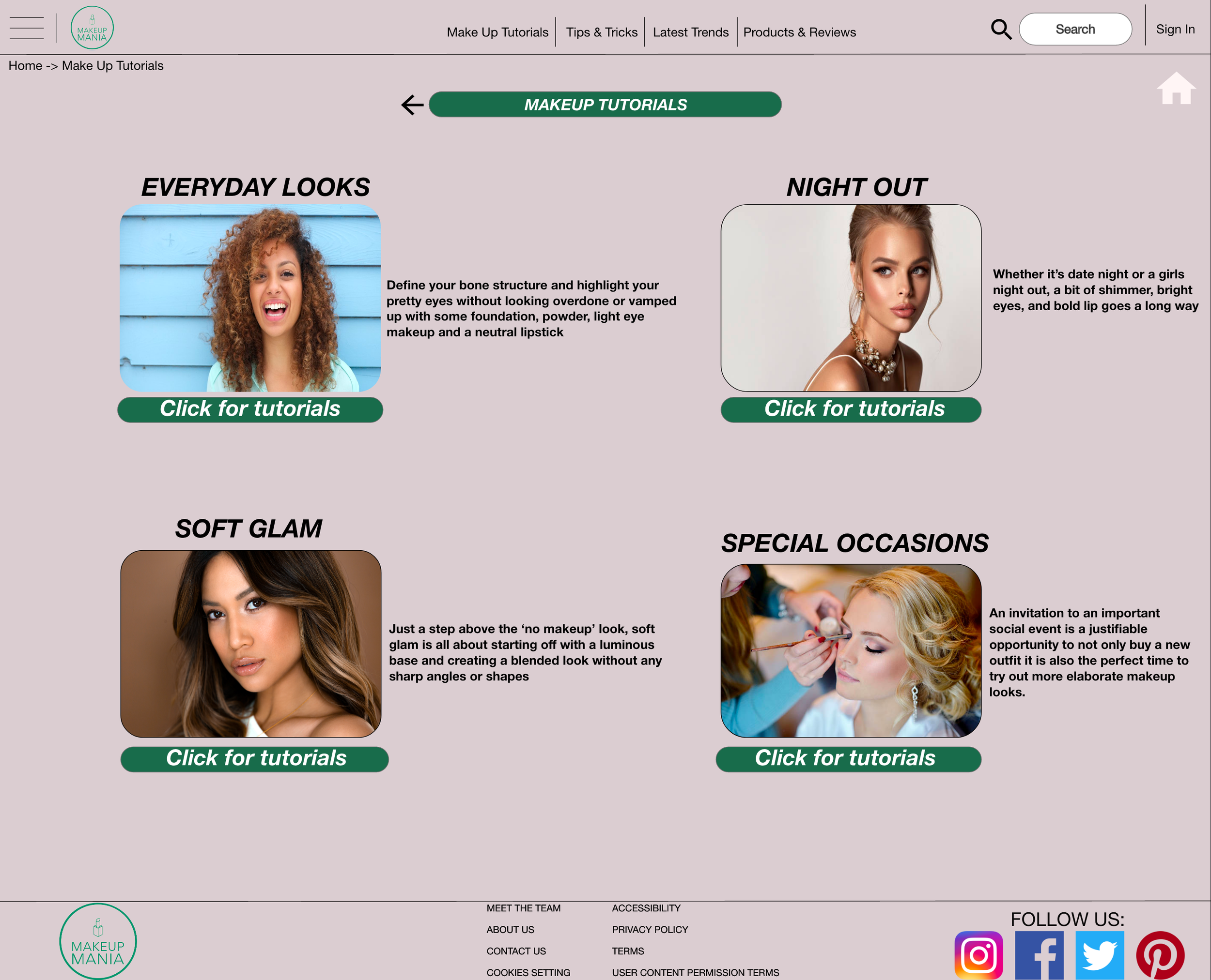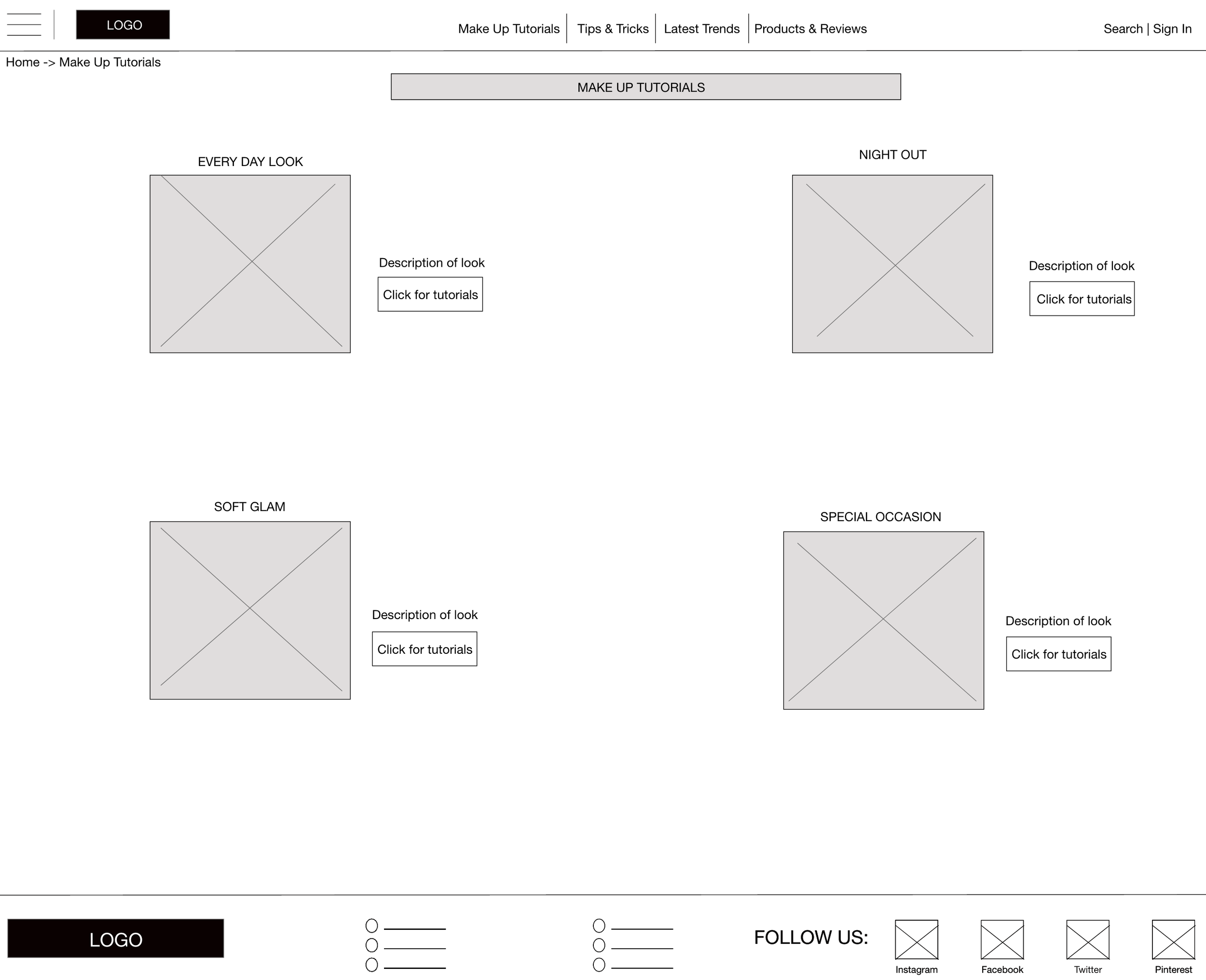 Wanting to keep the website as simple as possible, I decided to only create four main categories with one being “Make Up Tutorials” for users to easily navigate within the website and save time from endless searching. Of course, each main category leads to its own page, and from there are multiple sub-pages for users to access depending on what they are looking for whether it be overall beauty or makeup specific.